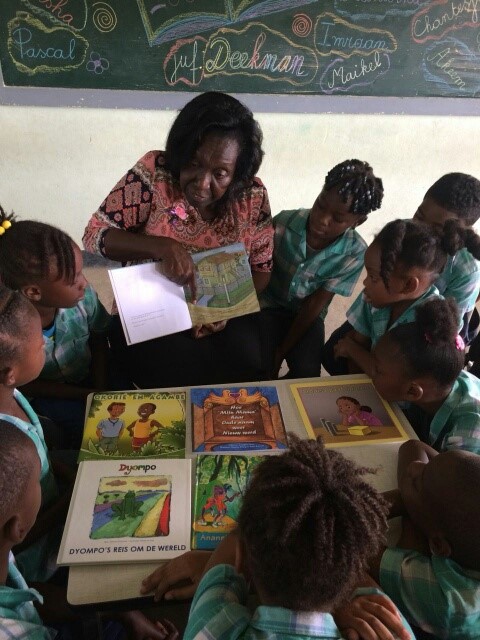 In de tweede klas van de R.E.C. Dothschool las Agnes Ritfeld voor uit het nieuwste prentenboek van Suriname ‘Blij met een ei’ geschreven door Margerie Stakel en geïllustreerd door Jurmen Kadosoe.