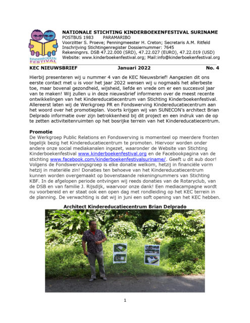 Met genoegen presenteert de Nationale Stichting Kinderboekenfestival Suriname haar vierde Nieuwsbrief over de ontwikkelingen van het Kindereducatiecentrum!